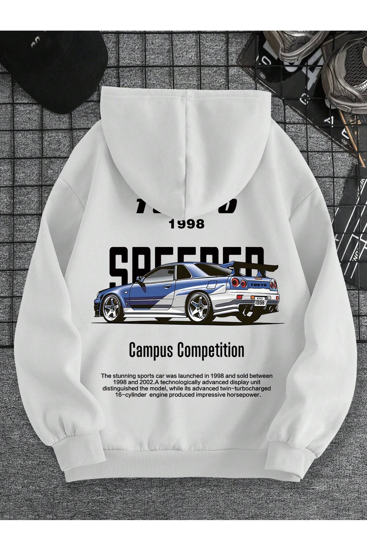 هودي أبيض كبير الحجم بطبعة طوكيو 1998 - هودي عالي الجودة بطباعة رقمية، قماش مريح وتصميم عصري من OBSCUR.