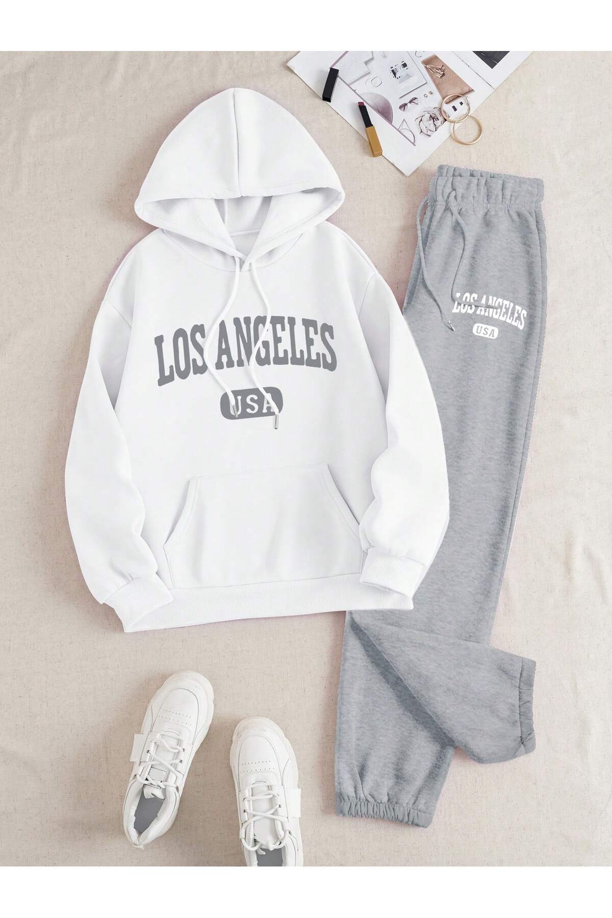 طقم سويتشيرت بغطاء رأس وبنطال رياضي 3 خيوط بطبعة Los Angeles للجنسين